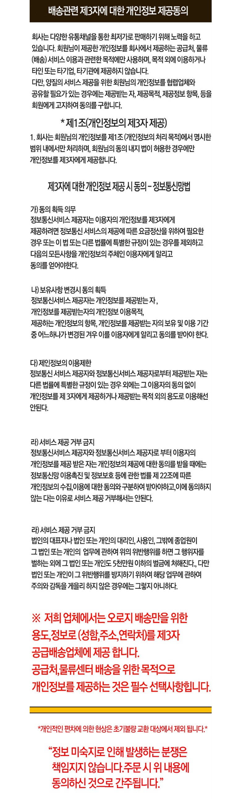 | 배송방법 | 순차배송 | 배송비 | 무료배송 · 도서산간 추가 배송비 - 제주 지역: 5,000원 - 도서산간 지역: 10,000원 |
