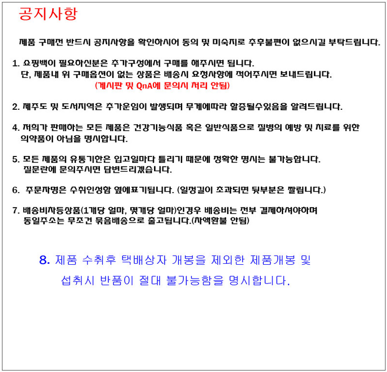 - 상품문의 및 후기게시판을 통해 취소나 환불, 반품 등은 처리되지 않습니다.