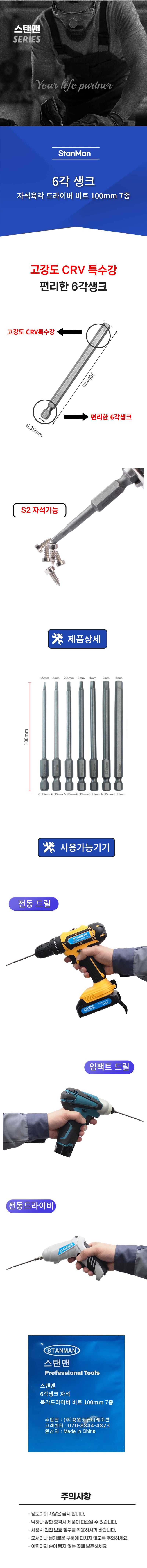 | 품명 및 모델명 | 스탠맨 6각생크 자석육각드라이버비트 100mm 7종세트 | 인증/허가 사항 | 해당없음 |