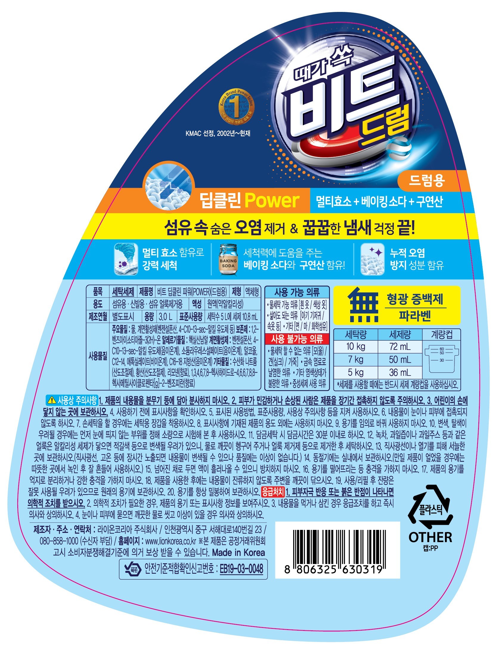 | 품목 및 제품명 | 세탁세제 / 비트 딥클린 파워(POWER)(드럼용) | 용도(표백제의 경우 계열을 함께표시) 및 제형 | 섬유용, 신발용, 섬유 얼룩제거용 / 액체형 |
