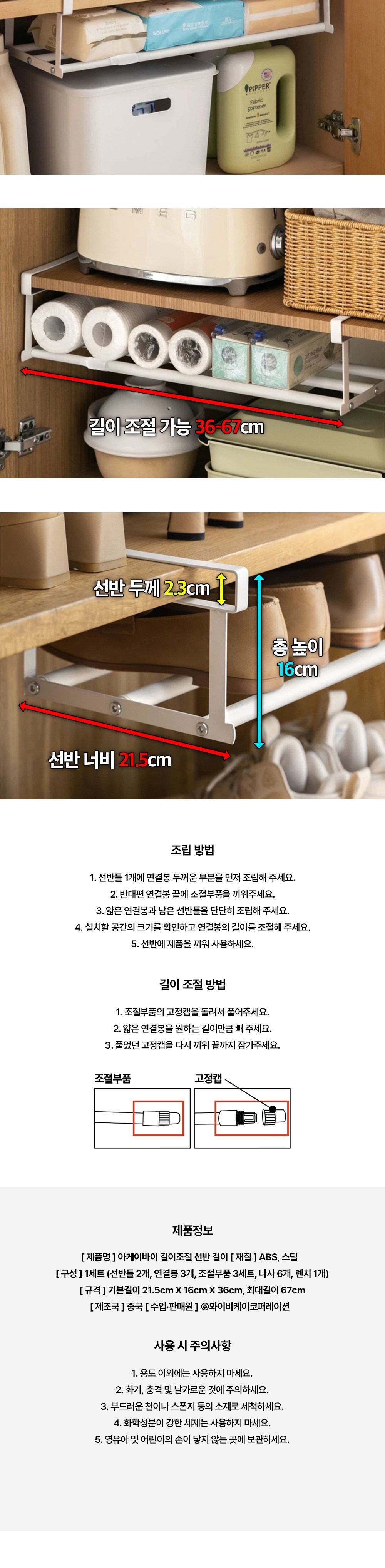 | 품명 및 모델명 | 아케이바이 고급형 길이조절 선반 걸이 | 인증/허가 사항 | 해당없음(14세 이상) |