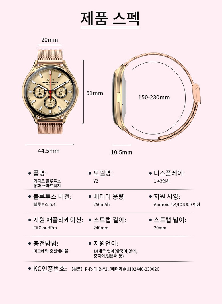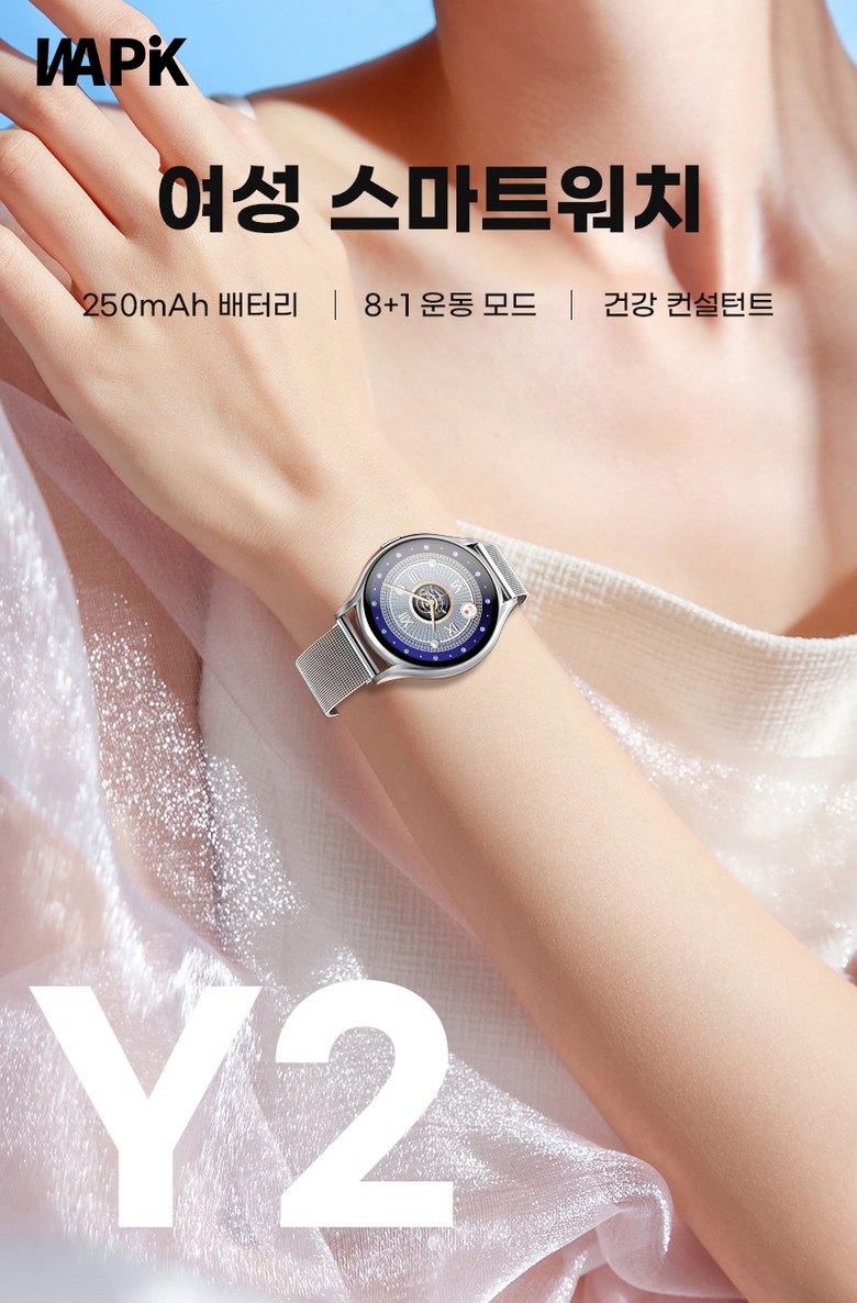 | 품명 및 모델명 | Wapik 블루투스 통화 여성 스마트워치 Y2 AMOLED 초슬림 패션시계 | KC 인증정보 | 본품:R-R-FHB-Y2배터리:XU102440-23002C |