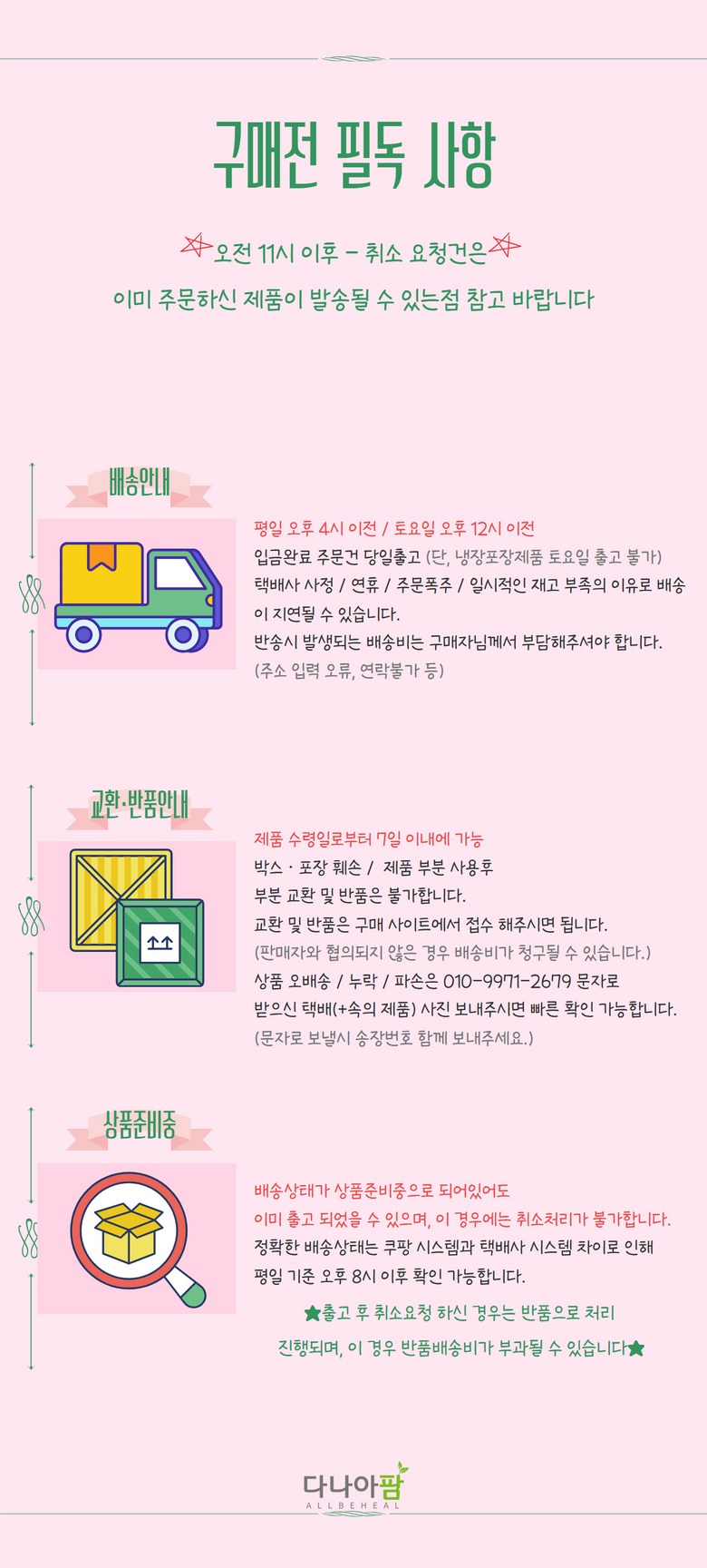 - ㆍ모니터 해상도의 차이로 인해 색상이나 이미지가 실제와 달라, 고객이 단순 변심으로 교환/반품을 무료로 요청하는 경우