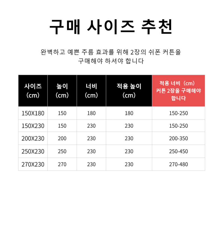 | 치수 | 150X180cm,150X230cm,200X230cm,250X230cm,270X230cm. | 제품구성 | 아일릿 커튼 |