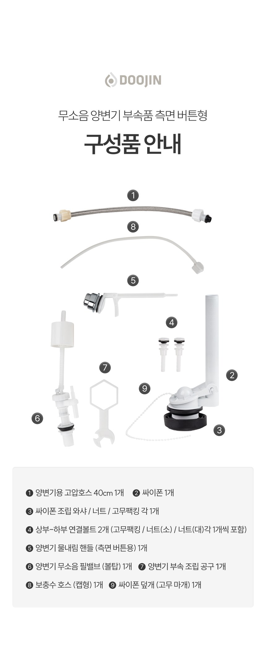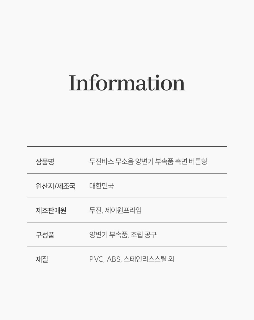 | 품명 및 모델명 | 두진바스 무소음 양변기 부속품 측면 버튼형 조립 공구 포함 단일색상 단일사이즈 | 인증/허가 사항 | 해당없음 |