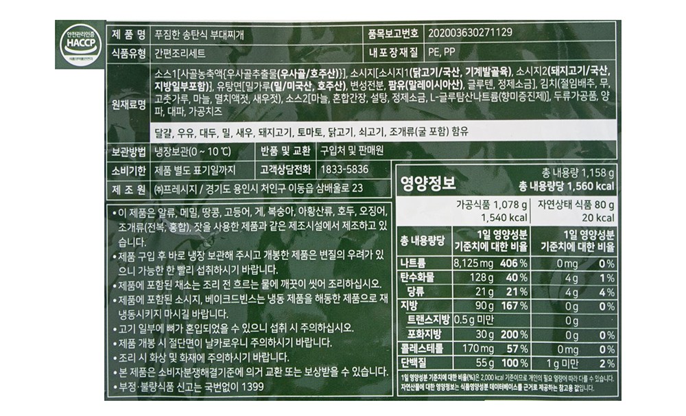 소시지를 푸짐하게 넣고 끓이는 송탄식 부대찌개를 이제 집에서 즐겨 보세요. 탱글탱글한 소시지는 물론이고, 아삭한 식감을 선사할 채소와 고소한 치즈 등 필요한 재료들로 구성되어 있어요. 번거로운 준비 과정 없이 간단한 조리만 거치면 근사한 요리가 완성되죠. 홈파티나 캠핑 시 메인 요리로 즐겨도 좋아요.