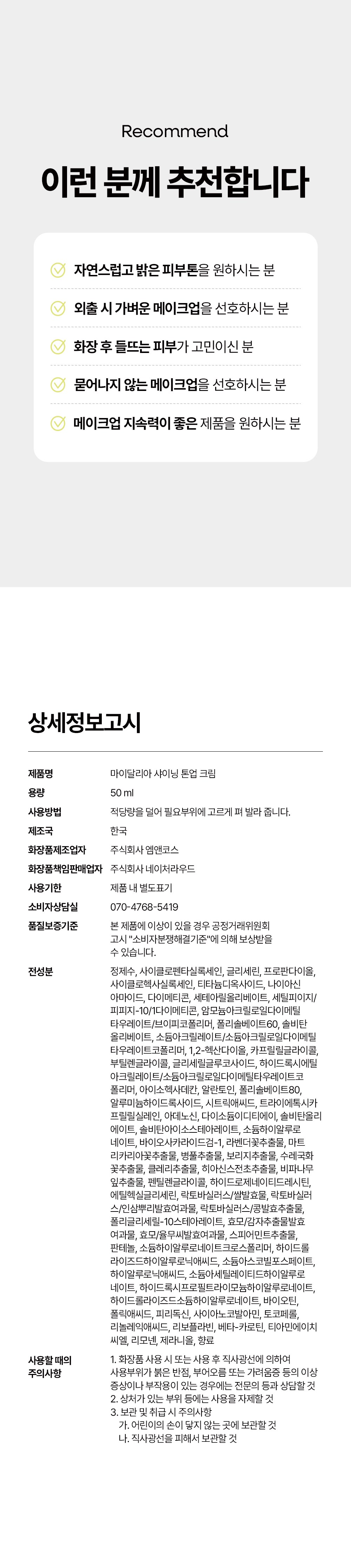 | 화장품제조업자, 화장품책임판매업자 및 맞춤형화장품판매업자 | 컨텐츠 참조 | 제조국 | 대한민국 |