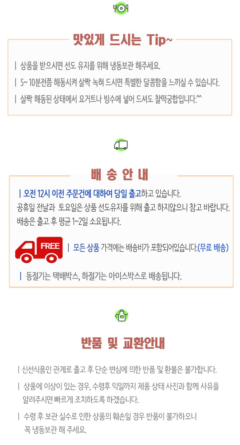 | 배송방법 | 신선/냉장/냉동 | 배송비 | 무료배송 - 도서산간 지역 배송불가 |