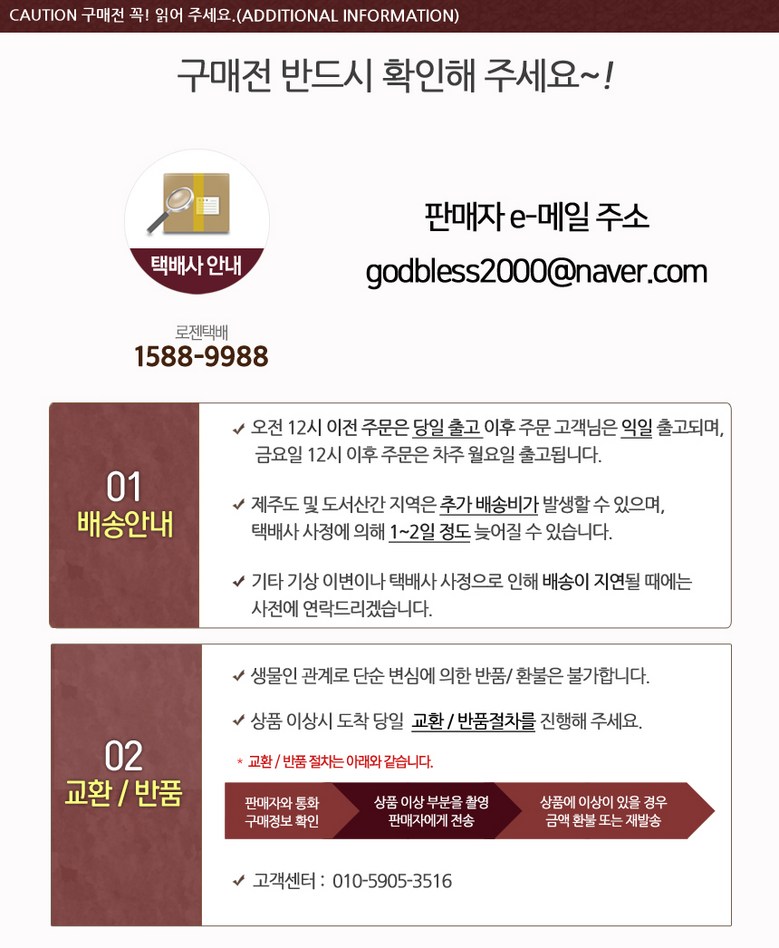 - ㆍ모니터 해상도의 차이로 인해 색상이나 이미지가 실제와 달라, 고객이 단순 변심으로 교환/반품을 무료로 요청하는 경우