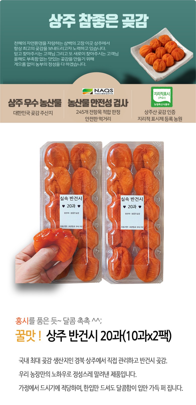 | 품목 또는 명칭 | 반건시 곶감 20과 | 포장단위별 내용물의 용량(중량),수량,크기 | 상품 상세페이지 참조 |