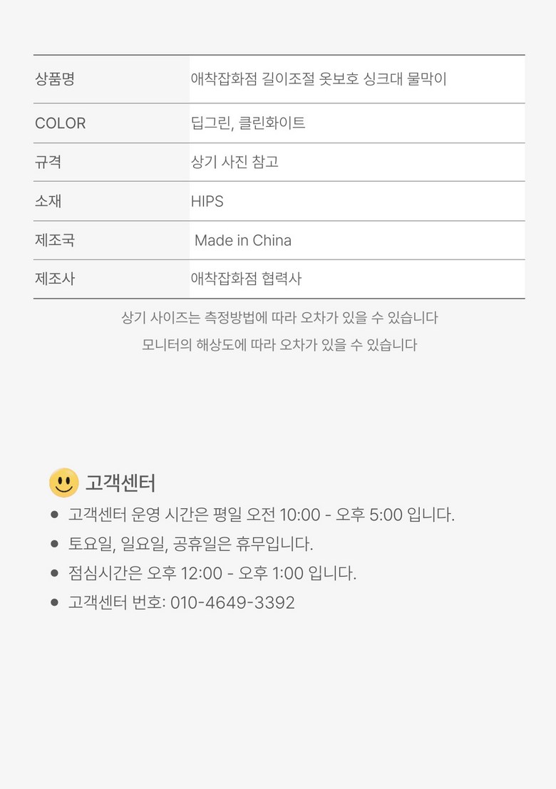 | 품명 및 모델명 | 애착잡화점 길이조절 싱크대 물막이 | 인증/허가 사항 | 해당 사항 없음 |