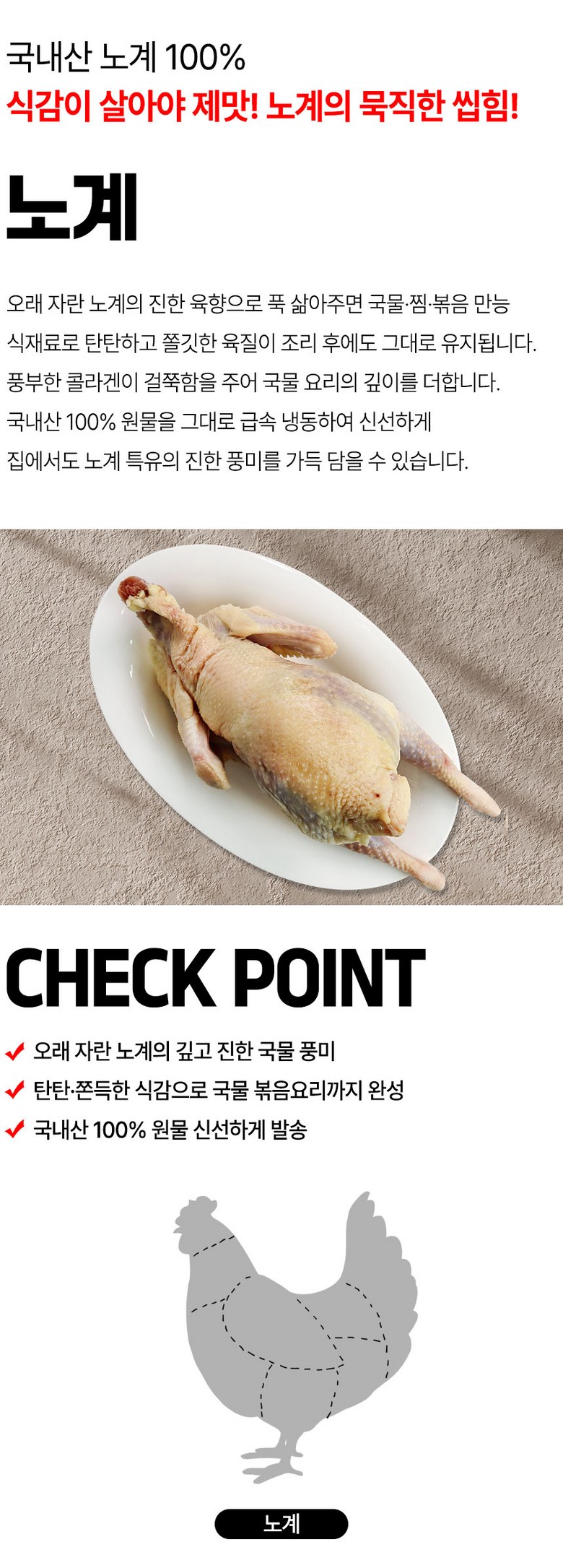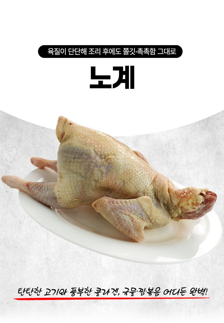 | 품목 또는 명칭 | 노계닭 | 포장단위별 내용물의 용량(중량),수량,크기 | 1.5kg 2마리 |