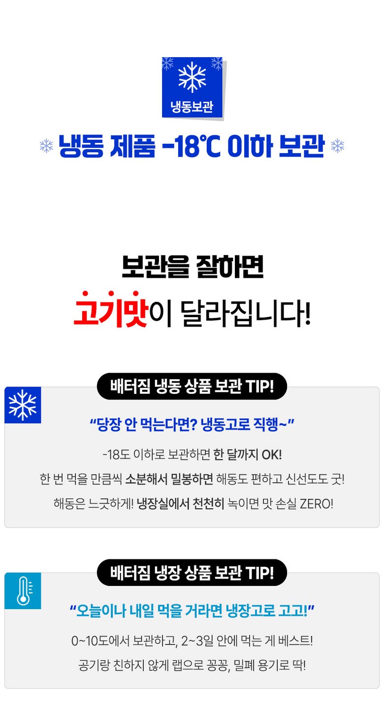 | 배송방법 | 신선/냉장/냉동 | 배송비 | 무료배송 · 도서산간 추가 배송비 - 제주 지역: 5,000원 - 도서산간 지역: 3,000원 |