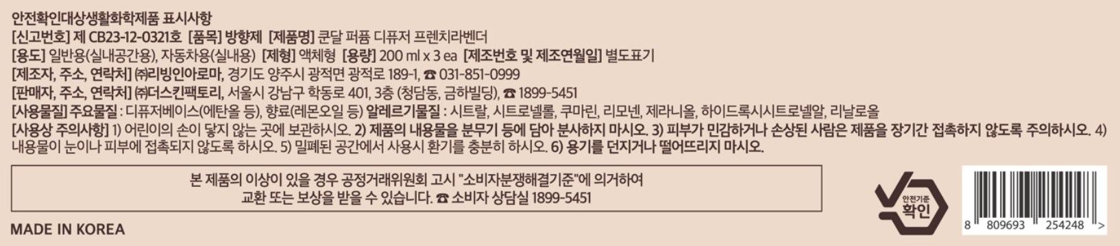 | 품목 및 제품명 | 방향제 / 쿤달 퍼퓸 디퓨저 아로마에디션 프렌치라벤더 | 용도(표백제의 경우 계열을 함께표시) 및 제형 | 일반용-실내공간용 / 액체형 |