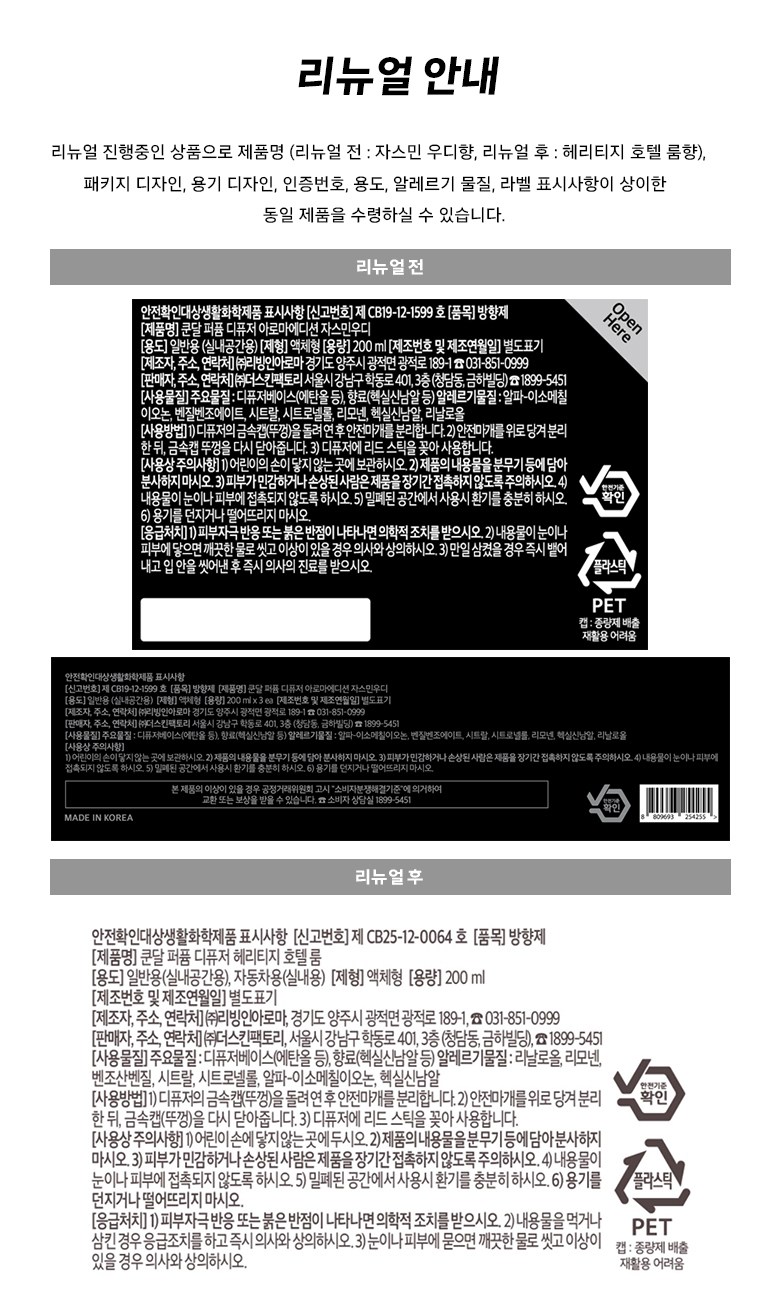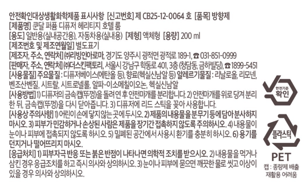 | 품목 및 제품명 | 방향제 / 리뉴얼 전: 쿤달 퍼퓸 디퓨저 아로마에디션 자스민우디 l 리뉴얼 후: 쿤달 퍼퓸 디퓨저 헤리티지 호텔 룸 | 용도(표백제의 경우 계열을 함께표시) 및 제형 | 자동차용-실내용/비분사형-액체형 |
