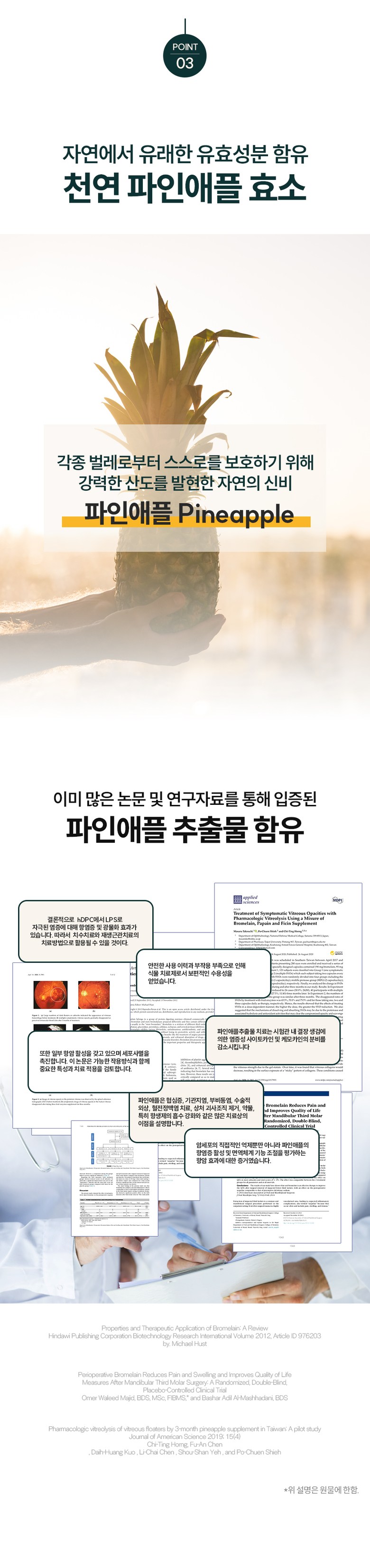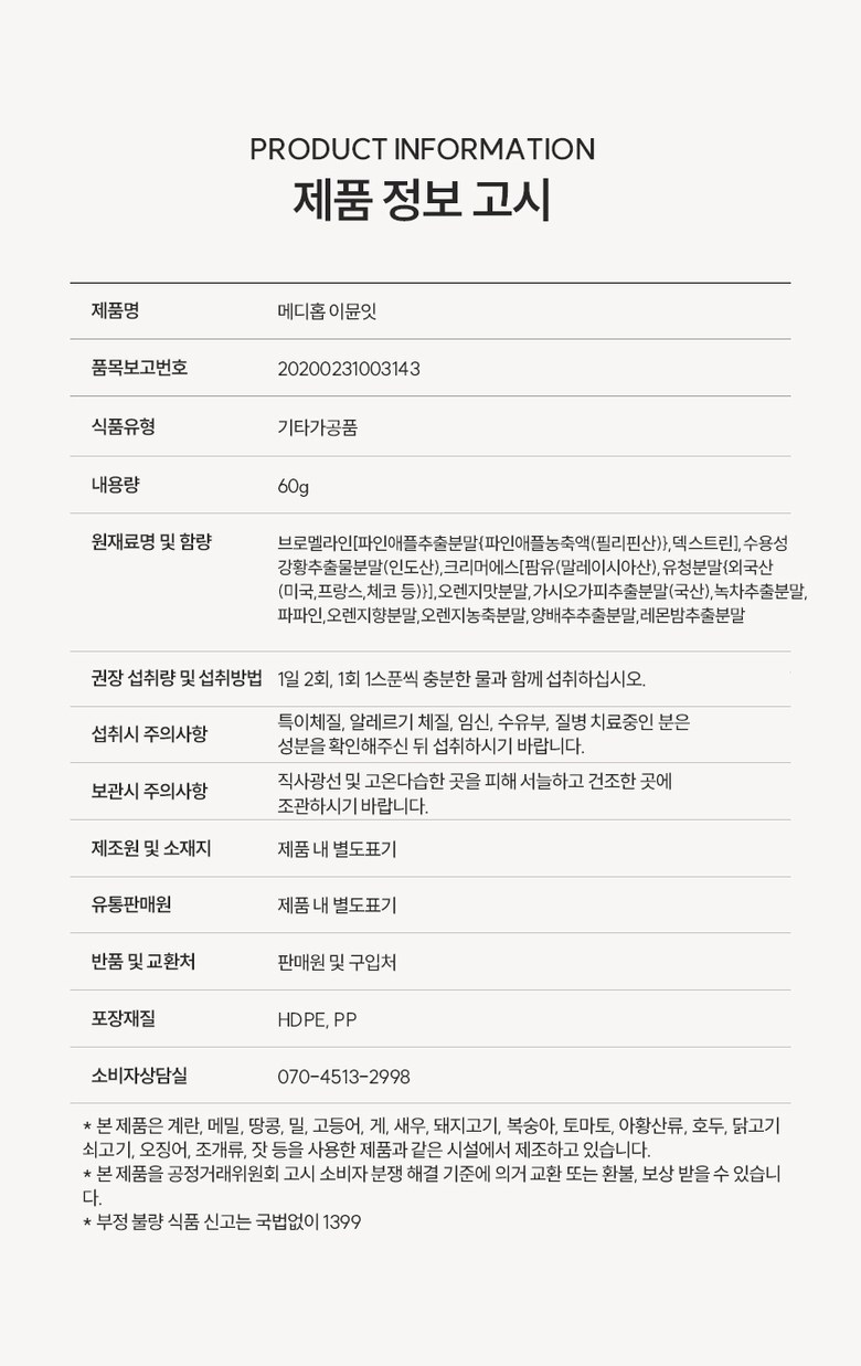 | 원재료명 및 함량 | 브로멜라인[파인애플추출분말{파인애플농축액(필리핀산)},덱스트린],수용성강황추출물분말(인도산),크리머에스[팜유(말레이시아산),유청분말{외국산(미국,프랑스,체코 등)}],오렌지맛분말,가시오가피추출분말(국산),녹차추출분말,파파인,오렌지향분말,오렌지농축분말,양배추추출분말,레몬밤추출분말 | 영양성분 | - |