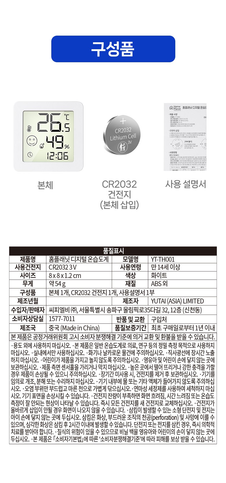 | 품명 및 모델명 | 홈플래닛 디지털 온습도계 | 인증/허가 사항 | 해당없음 |