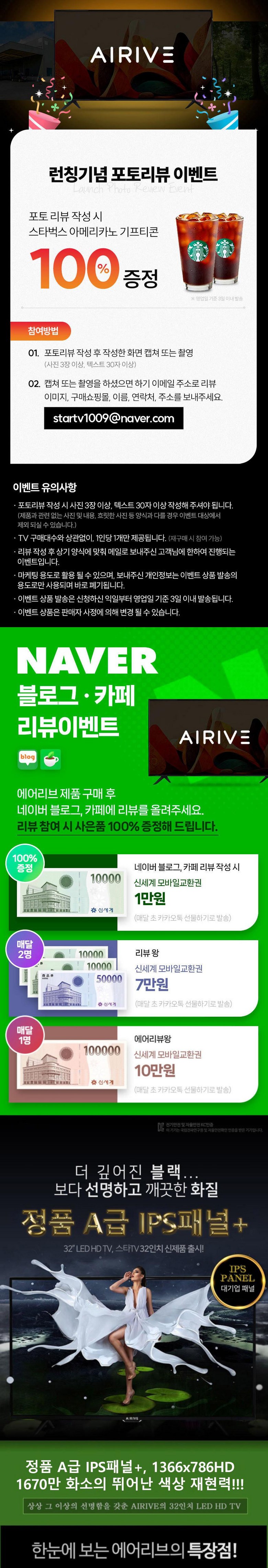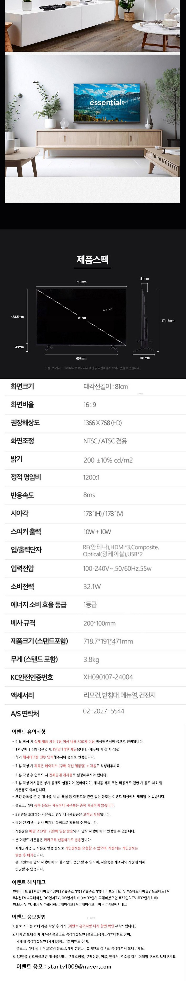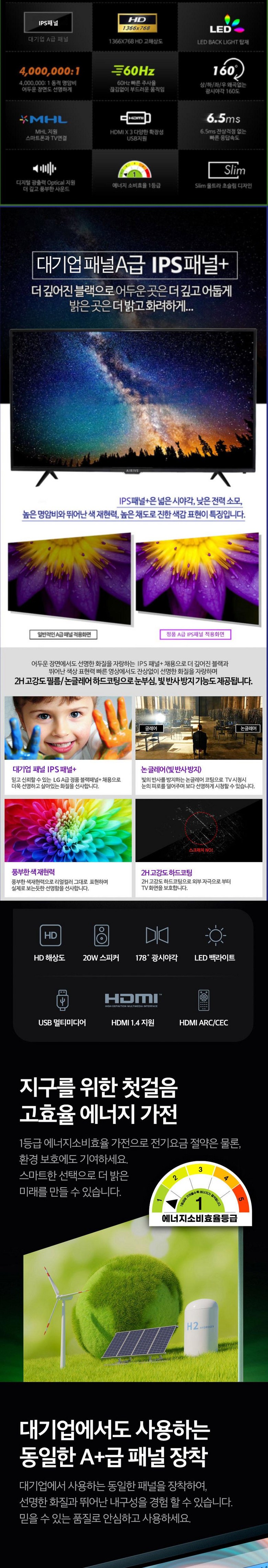 | 품명 및 모델명 | 에어리브 32인치 HD LED TV IPS패널 | KC 인증정보 | 상품 상세페이지 참조 |