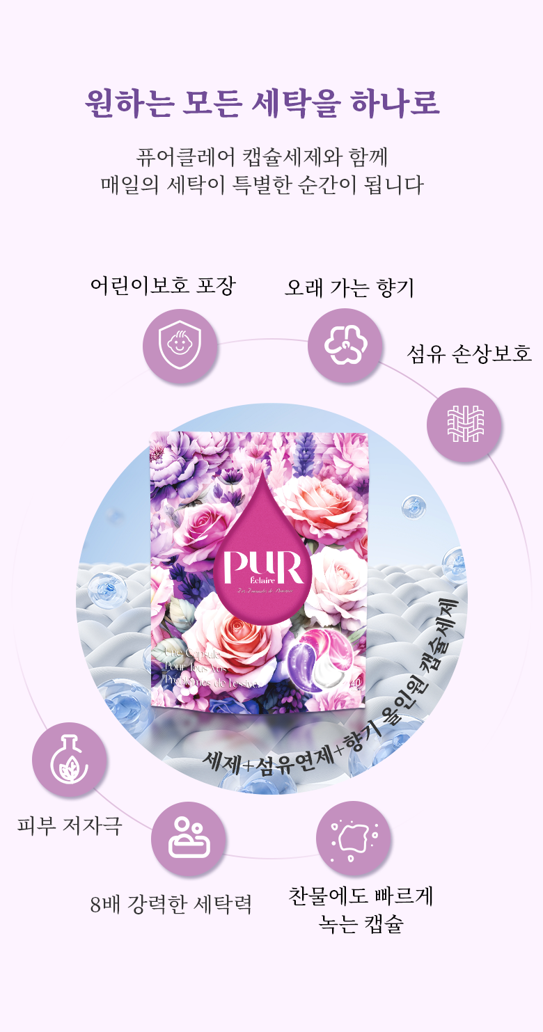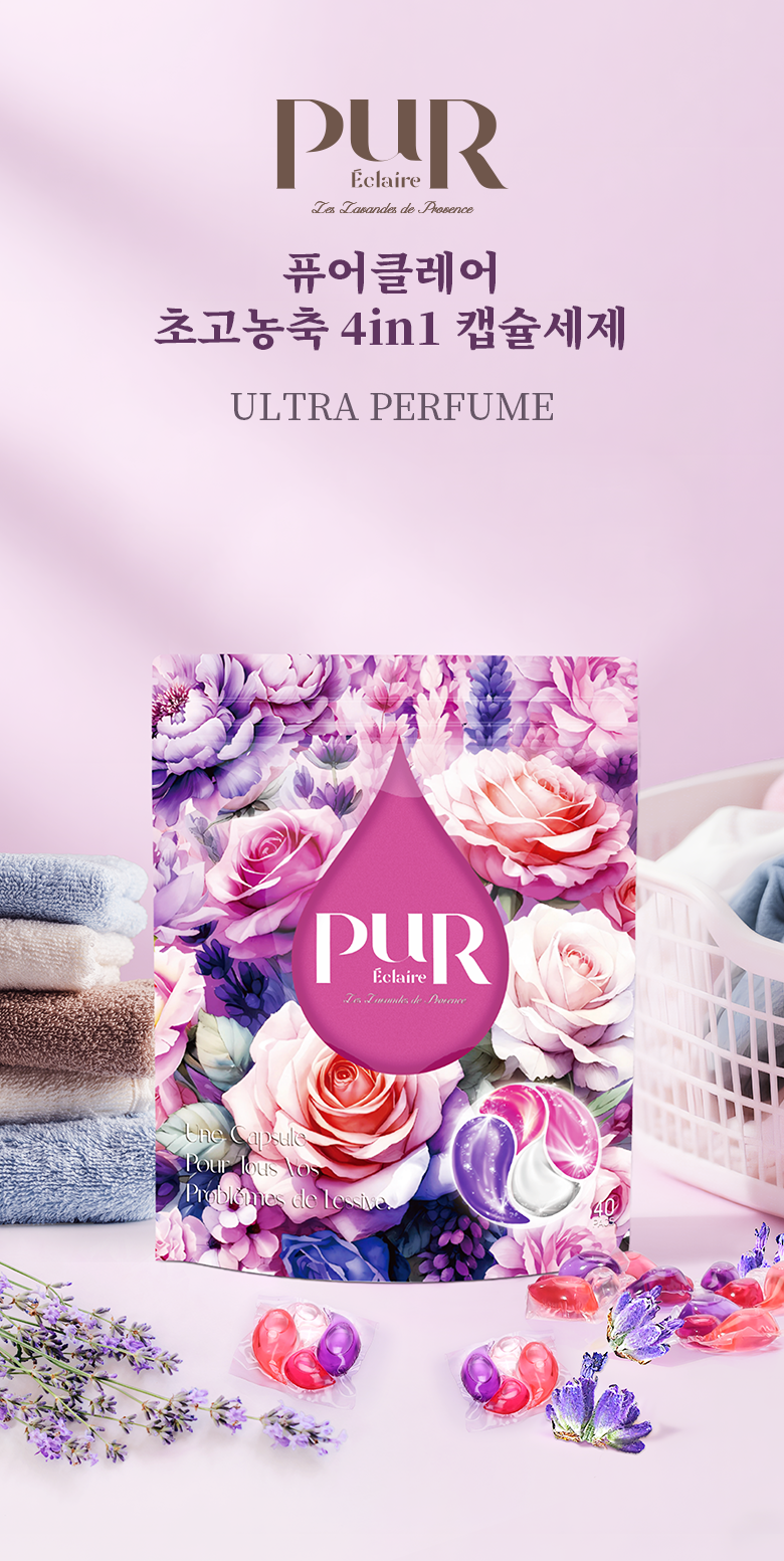 | 품목 및 제품명 | 세탁세제/퓨어클레어 울트라 퍼퓸 캡슐세제 | 용도(표백제의 경우 계열을 함께표시) 및 제형 | 섬유용,신발용, 섬유얼룩제거용 |
