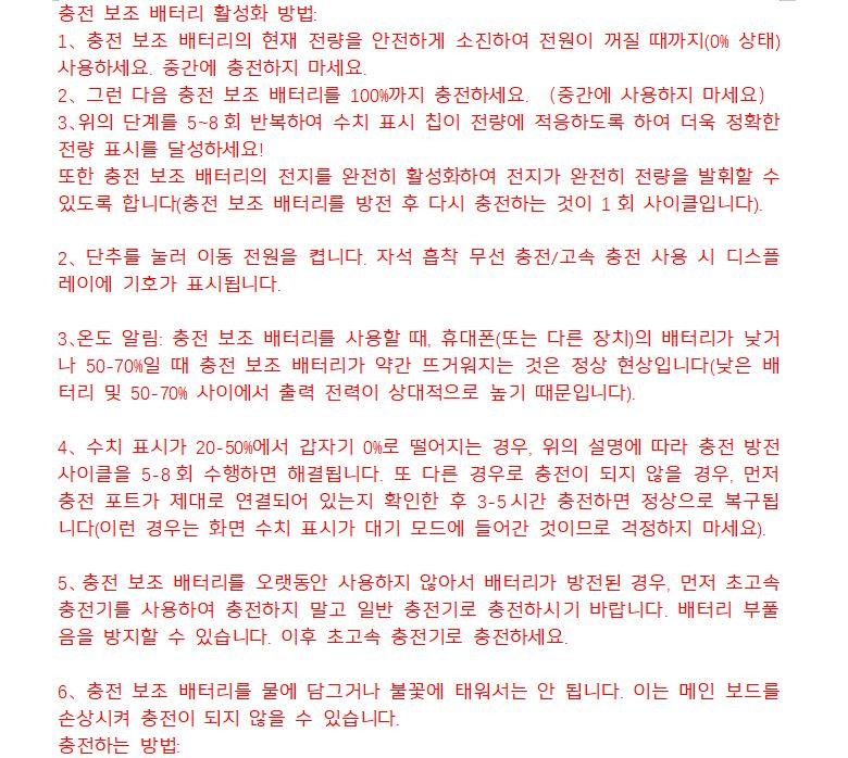 | 품명 및 모델명 | T186 | KC 인증정보 | 그런 다음 충전 보조 배터리를 100%까지 충전하세요. (중간에 사용하지 마세요)3、위의 단계를 5~8회 반복하여 수치 표시 칩이 전량에 적응하도록 하여 더욱 정확한 전량 표시를 달성하세요! |