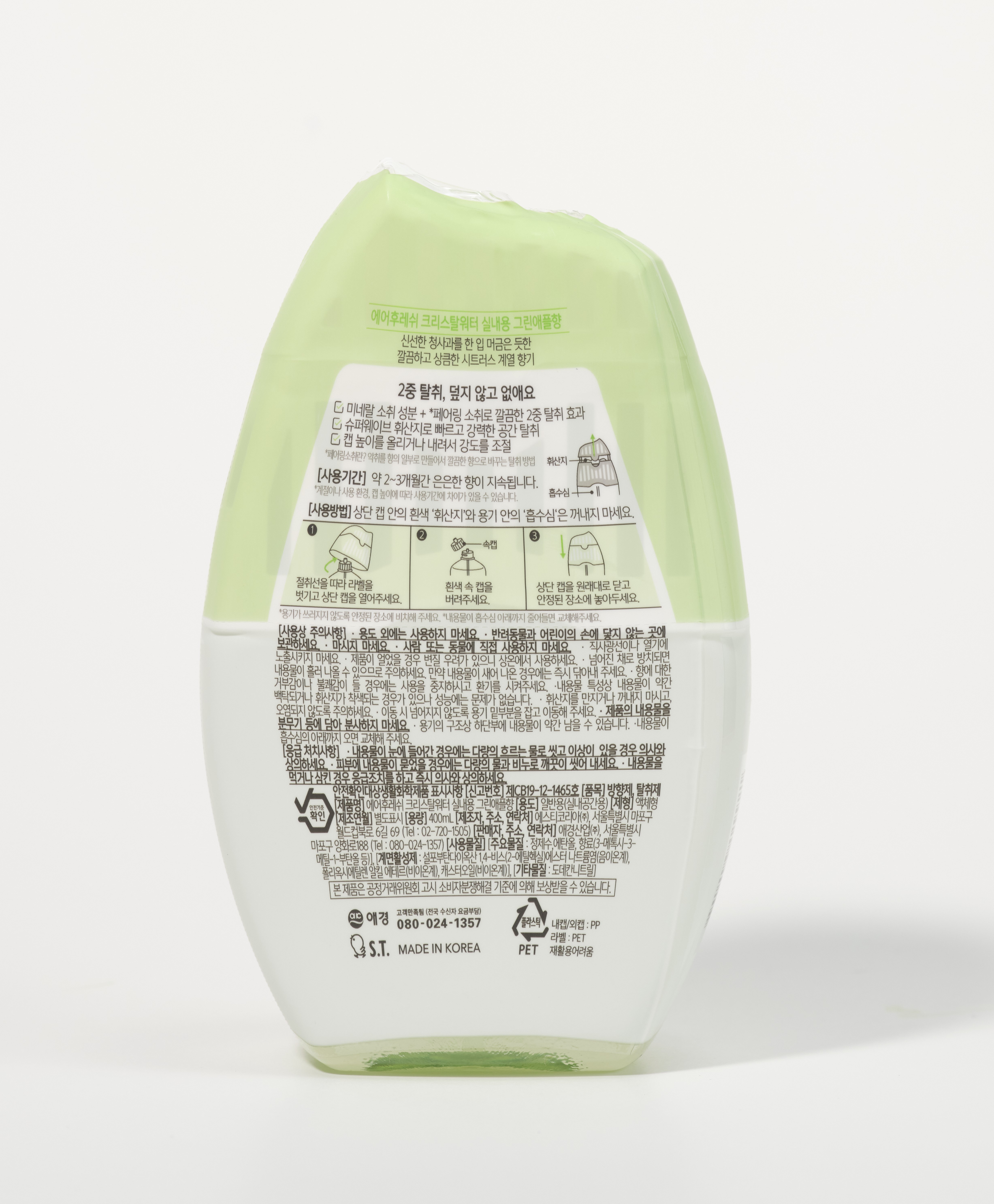 | 품목 및 제품명 | 방향제,탈취제 / 에어후레쉬 크리스탈워터 실내용 그린애플향 | 용도(표백제의 경우 계열을 함께표시) 및 제형 | 일반용-실내공간용 / 액체형 |