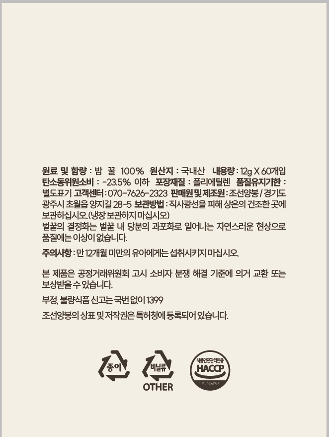 | 품목 또는 명칭 | 밤 꿀 | 포장단위별 내용물의 용량(중량),수량,크기 | 컨텐츠 참조 |