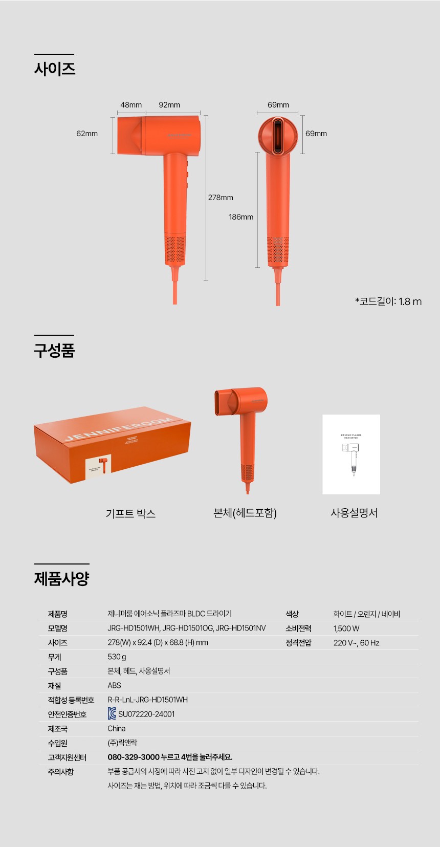| 품명 및 모델명 | 헤어드라이어(모발건조기) / JRG-HD1501OG | KC 인증정보 | SU072220-24001, R-R-LnL-JRGHD1501WH |