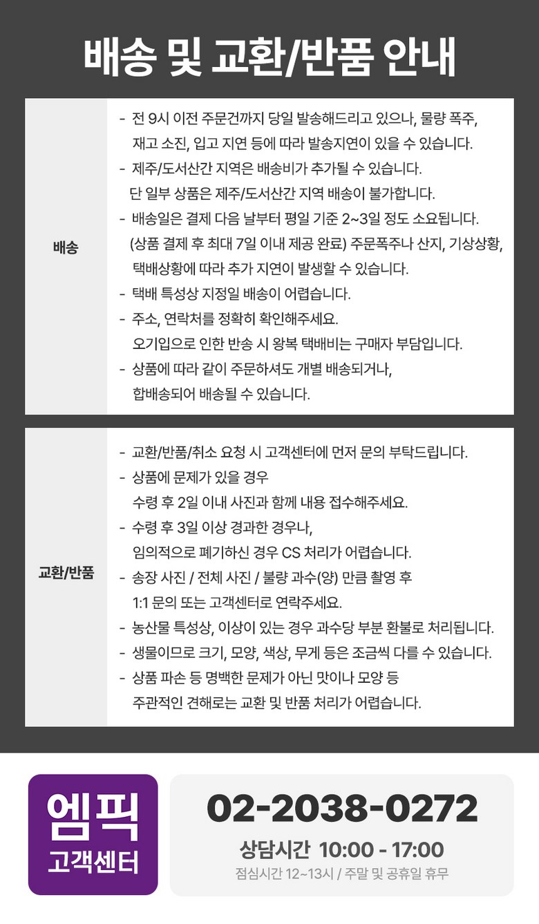 | 배송방법 | 순차배송 | 배송비 | 무료배송 - 도서산간 지역 배송불가 |