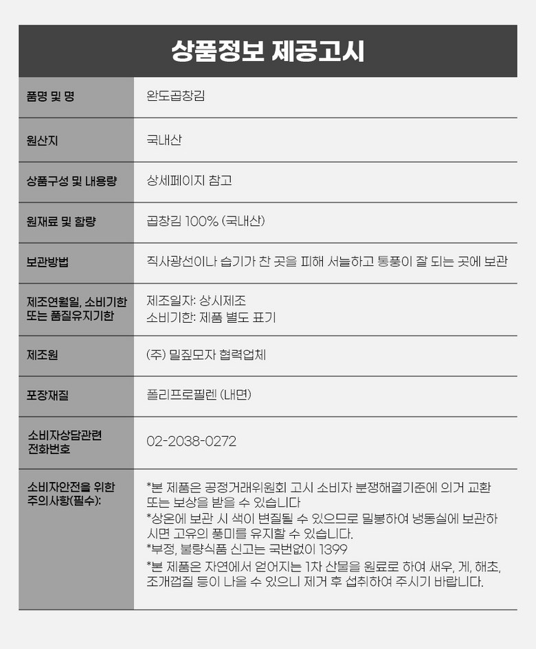 | 제조연월일, 소비기한 또는 품질유지기한 | 상품 상세페이지 참조 | 세부 품목군별 표시사항 | 상품 상세페이지 참조 |
