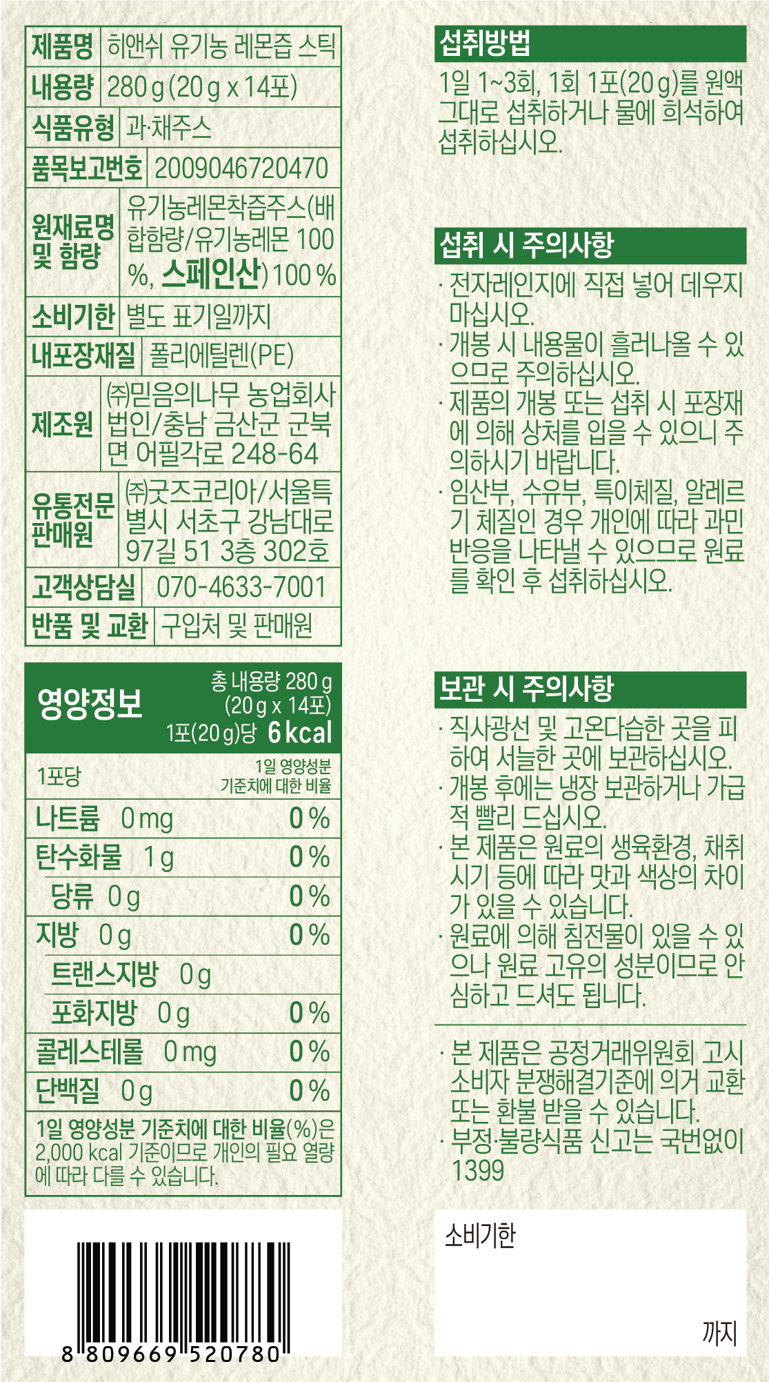 | 포장단위별 내용물의 용량(중량), 수량 | 20g x 70개 | 원재료명 및 함량 | 컨텐츠 참조 |
