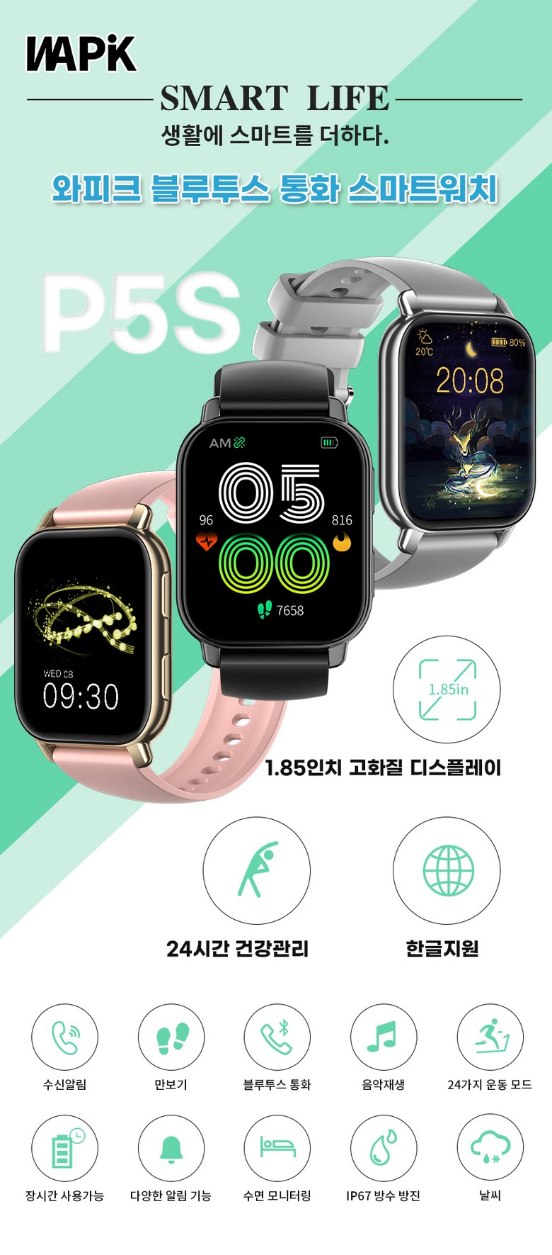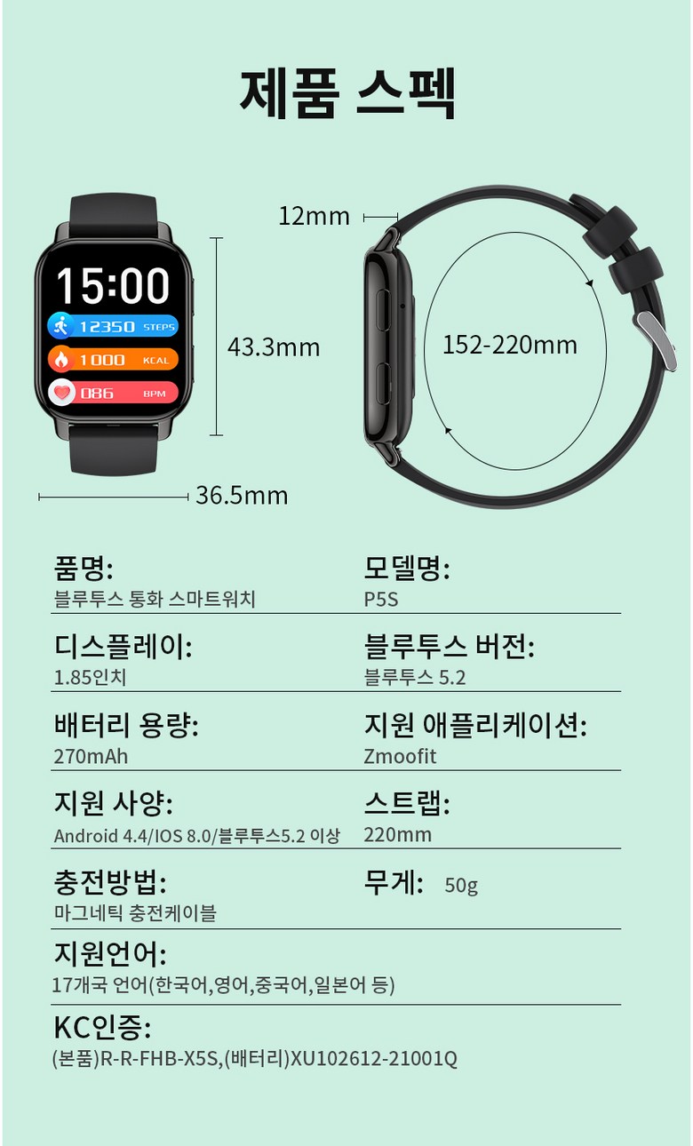 | 품명 및 모델명 | 통화가능 웨어러블 블루투스 스마트 워치 P5S 1.85인치 | KC 인증정보 | XU102612-21001Q/ R-R-FHB-X5S |