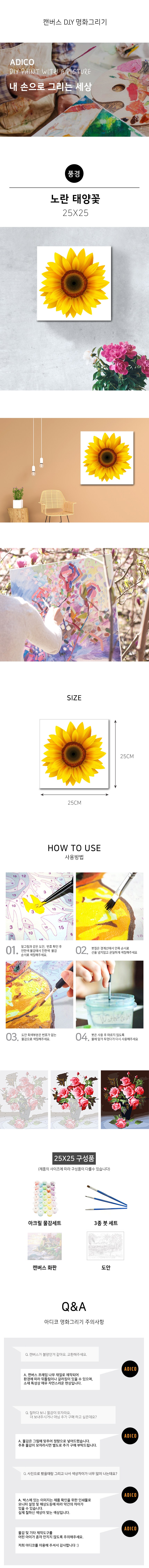 - 구성품: 아크릴 물감세트 + 3종 붓 세트 + 캔버스 화판 + 도안