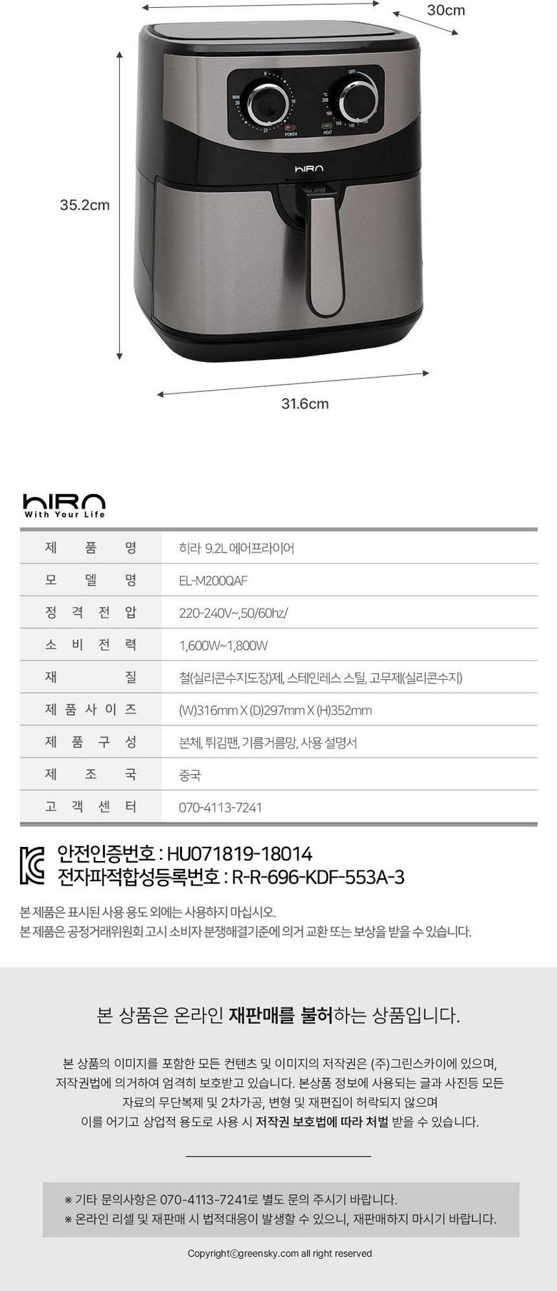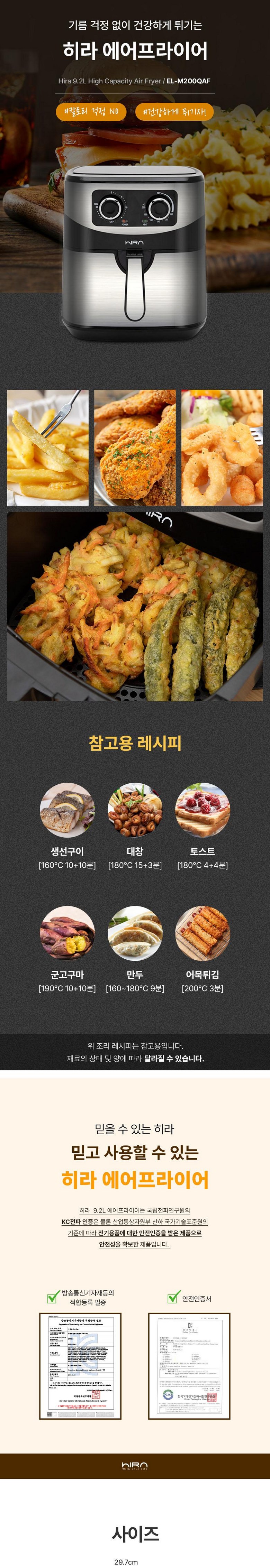 | 품명 및 모델명 | 히라 대용량 9.2L 에어프라이기 EL-M200QAF | KC 인증정보 | HU071819-18014R-R-696-KDF553A-3 |
