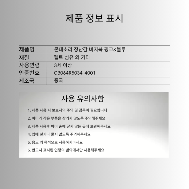 | 품명 및 모델명 | 몬테소리 장난감 비지북 | KC 인증정보 | CB064R5034-4001 |