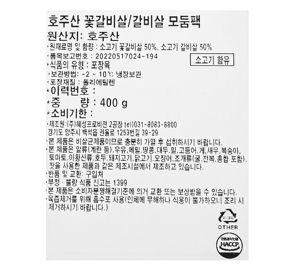 | 품목 또는 명칭 | 호주산 꽃갈비살/갈비살 모둠팩 | 포장단위별 내용물의 용량(중량),수량,크기 | 컨텐츠 참조 |