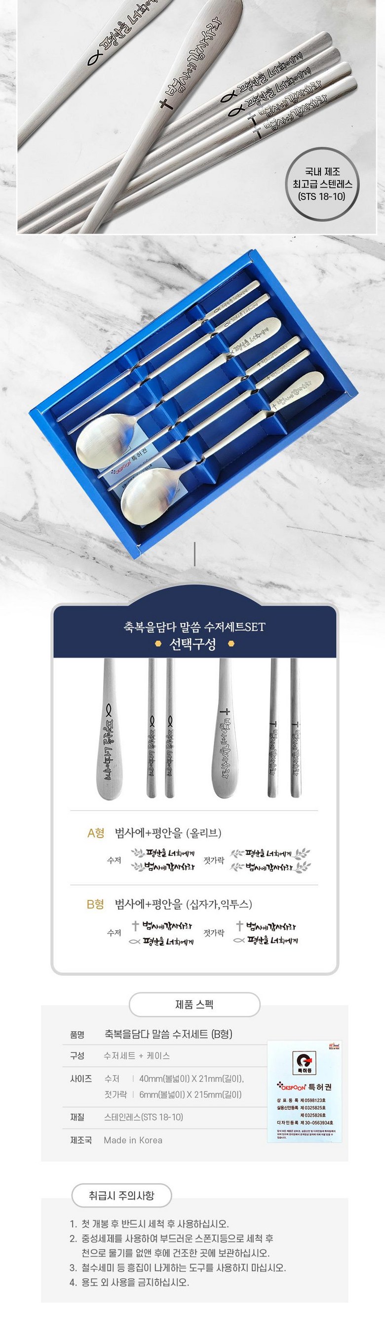 | 품명 및 모델명 | 축복을담다 말씀 수저 SET(B형:십자가,익투스) 수저세트 | 인증/허가 사항 | 법에 의한 인증·허가 등을 받았음을 확인할 수 있는 경우 그에 대한 사항 |