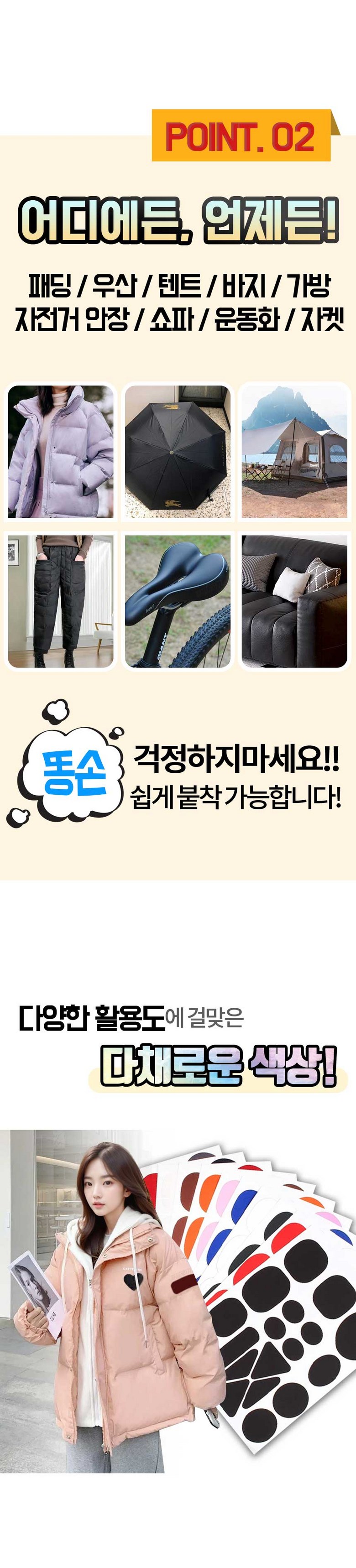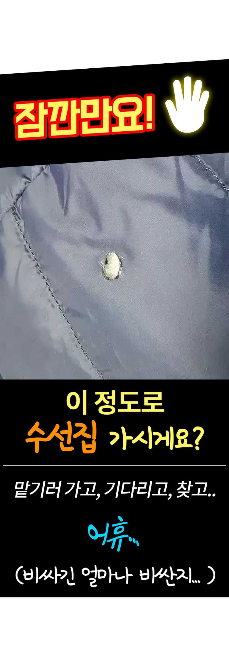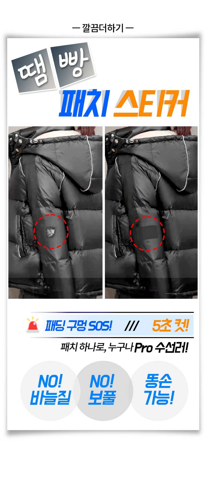 | 품명 및 모델명 | 깔끔더하기 패딩 수선 스티커 | 인증/허가 사항 | 해당 사항 없음 |