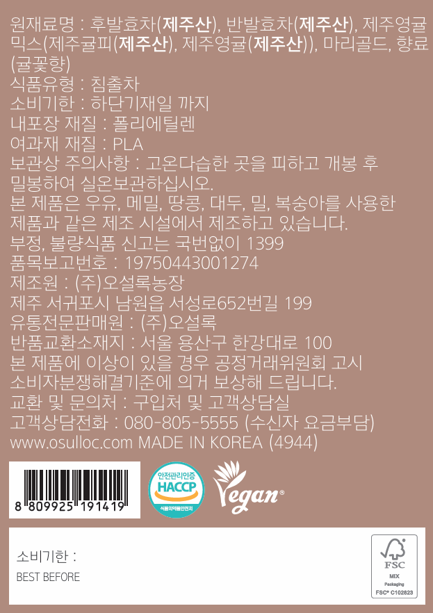 | 제품명 | 오설록 귤꽃향을 품은우잣담 | 식품의 유형 | 컨텐츠 참조 |