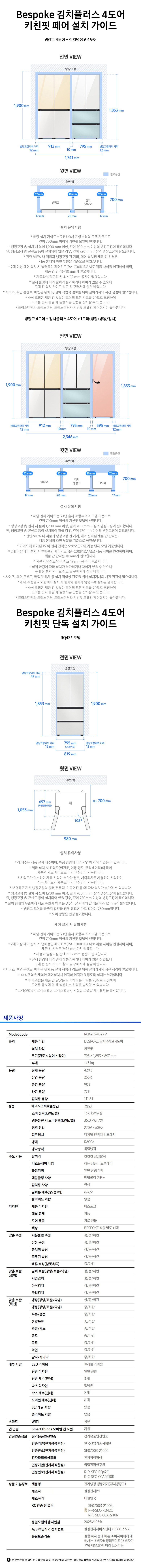 | 품명 및 모델명 | 전기냉장·냉동기기 / RQ42C94G2AP | KC 인증정보 | 본품 : SE07003-21005J, R-R-SEC-RQ42C / 무선기기 : R-C-SEC-CCAR210R |