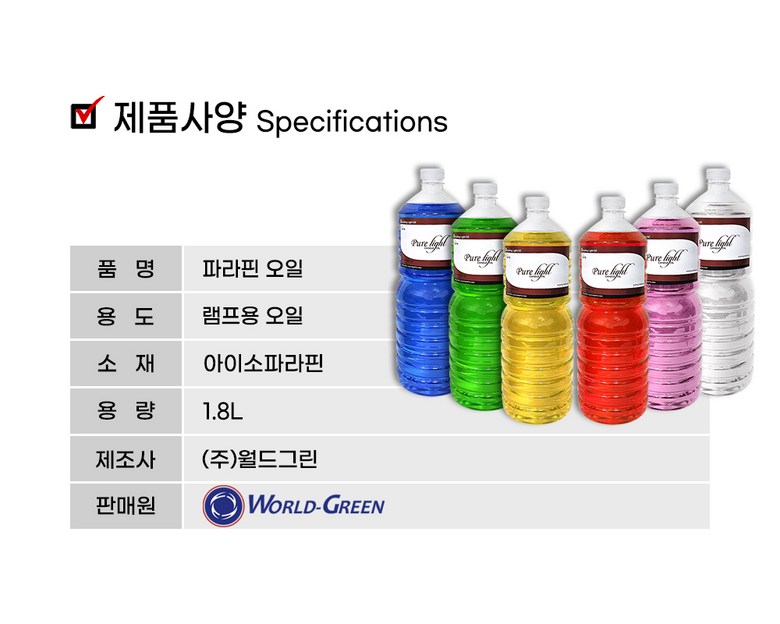 | 품목 및 제품명 | 파라핀 오일 | 용도(표백제의 경우 계열을 함께표시) 및 제형 | 램프 오일 / 비분사형-액체형 |