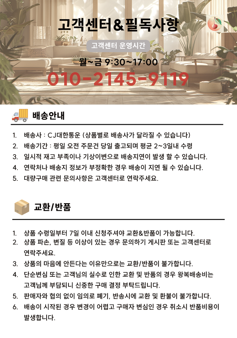- ㆍ모니터 해상도의 차이로 인해 색상이나 이미지가 실제와 달라, 고객이 단순 변심으로 교환/반품을 무료로 요청하는 경우