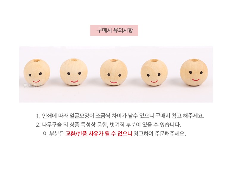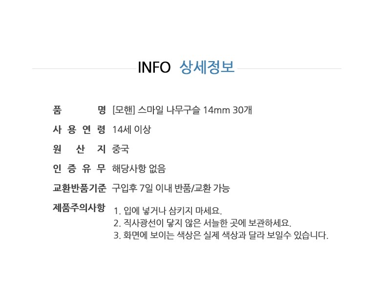 | 품명 및 모델명 | 품명:14mm 스마일 나무구슬(6개) / 모델명:N | 인증/허가 사항 | 법에 의한 인증·허가 등을 받았음을 확인할 수 있는 경우 그에 대한 사항:N |