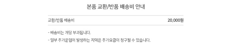 | 교환/반품 비용 (왕복비용) | 10,000원 - 단, 고객 변심의 경우에만 발생 - 도서산간 및 일부 지역 추가비용 발생 |