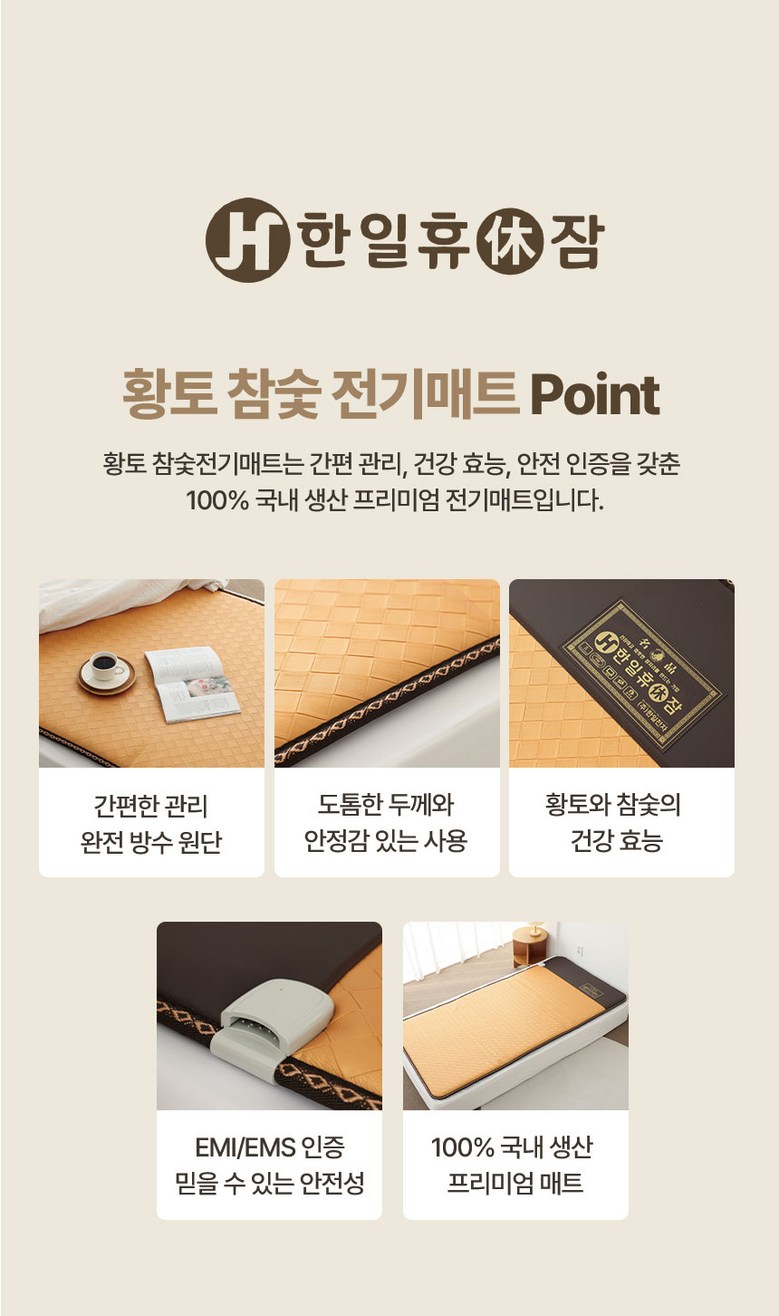 | 품명 및 모델명 | 한일전자 프리미엄 황토전기매트 | KC 인증정보 | 전기용품 안전인증 싱글 / 더블 HO07026-15003F |