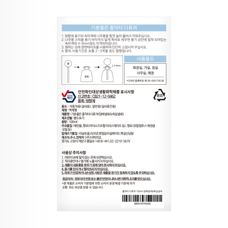 | 품목 및 제품명 | 방향제/ 기분좋은 홈닥터 디퓨저(담배냄새&욕실냄새) | 용도(표백제의 경우 계열을 함께표시) 및 제형 | 자동차용-실내용,일반용-실내공간용/비분사형-액체형 |