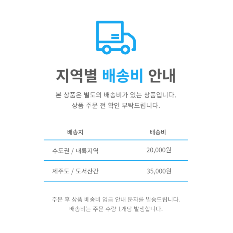 | 배송방법 | 순차배송 | 배송비 | 착불배송(상품별 배송비, 배송가능지역은 상세페이지 참조) · 도서산간 추가 배송비 - 제주 지역: 4,000원 - 도서산간 지역: 7,000원 |