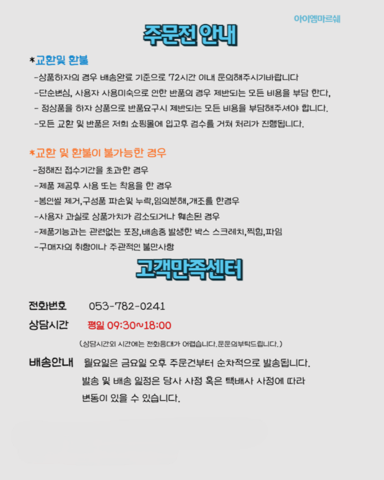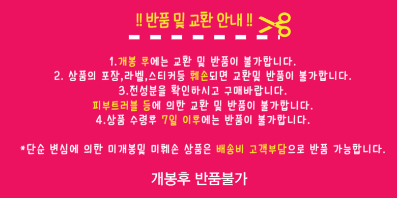 - ㆍ모니터 해상도의 차이로 인해 색상이나 이미지가 실제와 달라, 고객이 단순 변심으로 교환/반품을 무료로 요청하는 경우