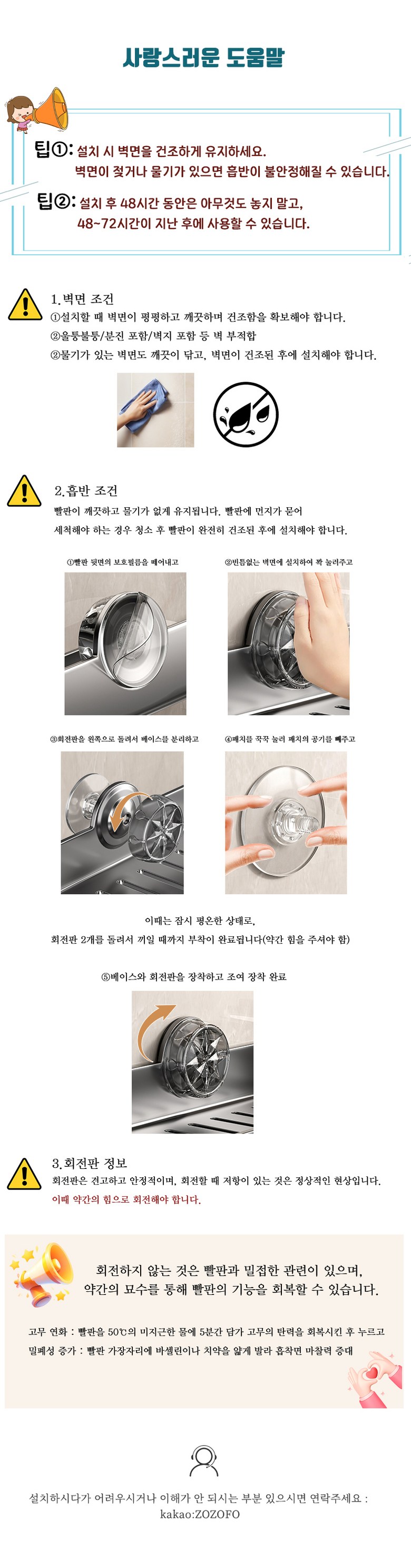 | 소비자상담 관련 전화번호 | ①설치 시 벽면을 건조하게 유지하세요.②벽면이 젖거나 물기가 있으면 흡반이 불안정해질 수 있습니다.③문의사항이 있으시면 카카오 ID:ZOZOFO 연락주시기 부탁드립니다. | ||