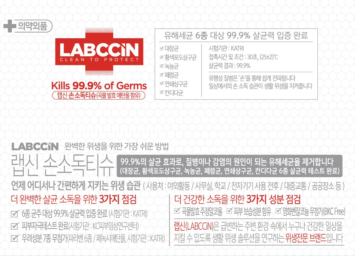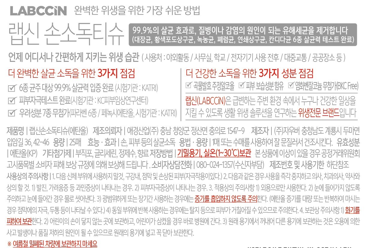 | 품명 및 모델명 | 랩신손소독티슈(에탄올) | 인증/허가 사항 | 의약외품 |