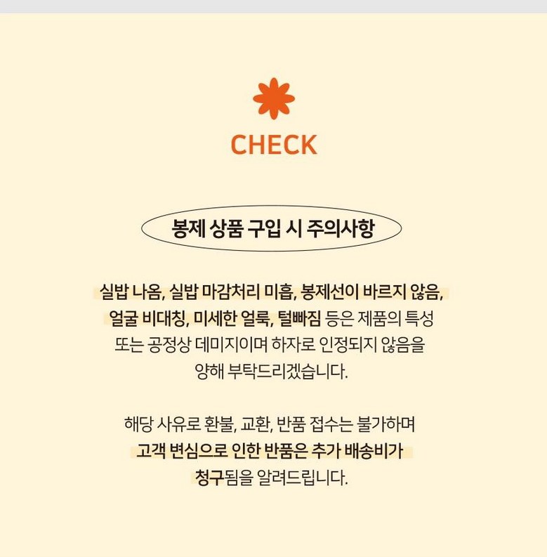 - ㆍ모니터 해상도의 차이로 인해 색상이나 이미지가 실제와 달라, 고객이 단순 변심으로 교환/반품을 무료로 요청하는 경우